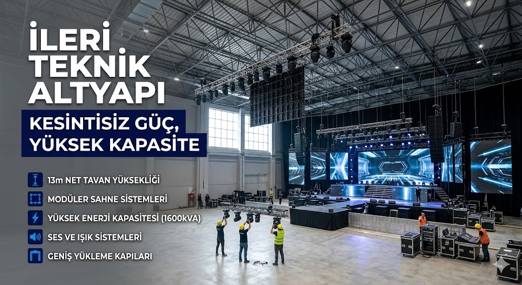 2.000 m² ana arena alanı, 13 metre tavan yüksekliği ve tesisle entegre 5 yıldızlı konaklama imkanıyla, global standartlarda bir etkinlik deneyimi sunuyoruz. Bugüne kadar yüzlerce ulusal ve uluslararası organizasyona ev sahipliği yapmış olmanın gururuyla hizmetinizdeyiz.